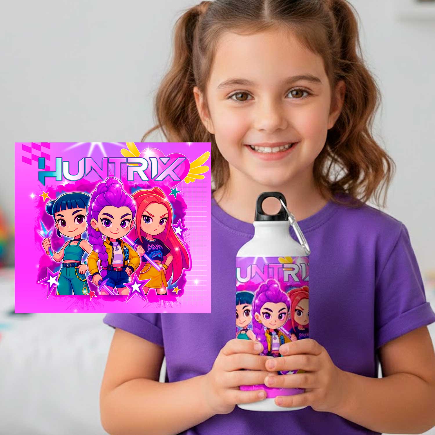Te ofrecemos personalizar esta botella con ilustraciones exclusivas inspiradas en el universo Huntrix, el grupo de chicas K-pop que tienen una doble vida tan potente como su estética: superestrellas sobre el escenario y cazadoras en la sombra. Las plantillas disponibles se basan en este imaginario visual, con diseños llamativos y llenos de carácter.