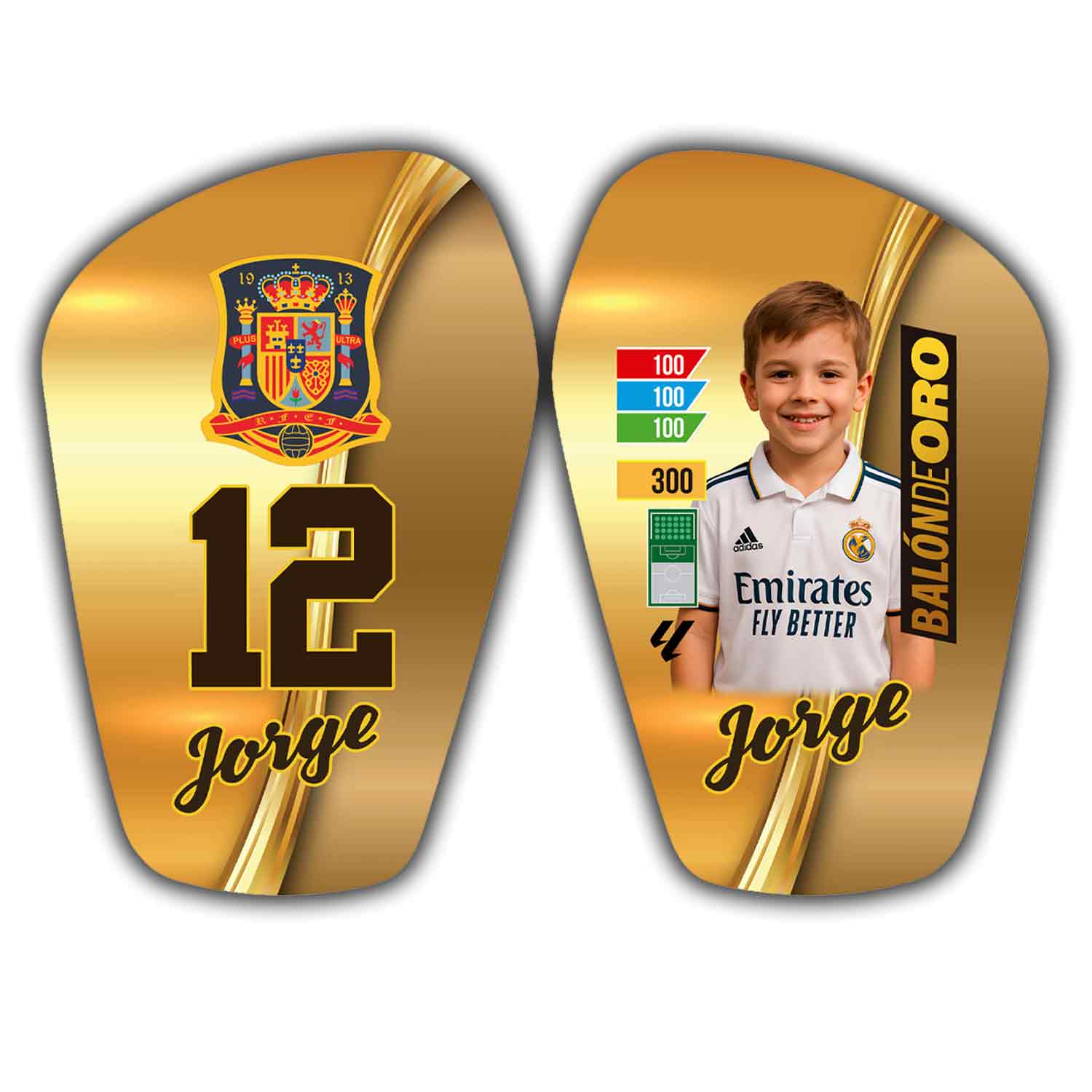 El diseño incluye fondo dorado efecto metálico, número grande estilo profesional y opción de añadir fotografía del jugador con equipación. Son perfectas para escuelas de fútbol, equipos infantiles, torneos y regalos personalizados deportivos. Si buscas un detalle original para un pequeño futbolista, estas espinilleras modelo Balón de Oro son una apuesta segura.