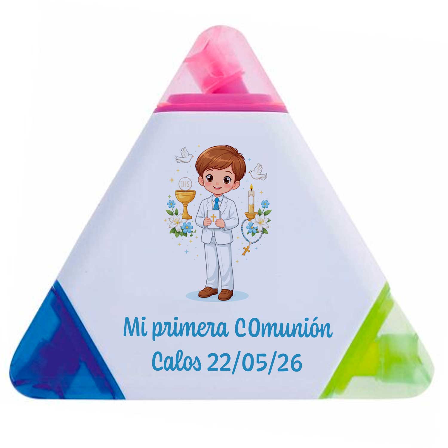 Este marcador personalizado para eventos es un artículo promocional original, práctico y muy visual, ideal para empresas, ferias, congresos, bodas, comuniones, colegios y campañas publicitarias. Su diseño triangular compacto destaca por integrar varios colores en los extremos y una amplia zona central blanca, perfecta para la personalización con logotipos, textos o diseños corporativos.